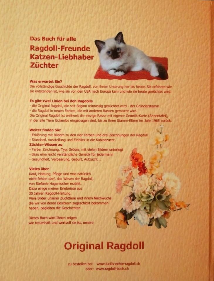 Sie ist da, die erste vollständige Ragdoll-Geschichte von 55 Jahren - so wie ein spannender Einblick in die Katzenzucht mit leicht erklärter Genetik für den Ragdoll-Liebhaber und den Ragdoll-Züchter. Ein Buch das viel verspricht, für jeden der die Ragdoll kennen lernen möchte. Für Neuzüchter ist es eine grosse Hilfe. Was sicher viele Leser interessiert: das Wesen der Ragdoll, ihr Typ, Haltung, Kauf, Ausstellung und so vieles mehr.